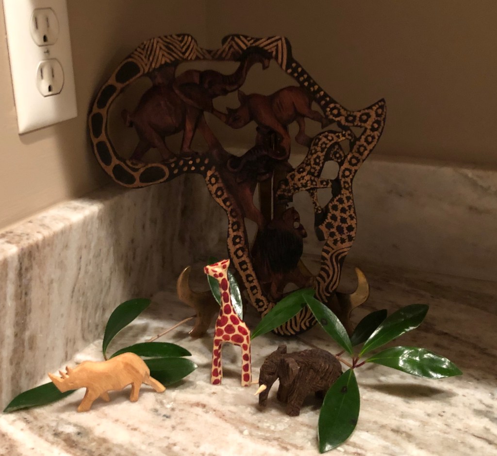 One of our memorable side trips in South Africa was to this little pottery. One of our members discovered the location from seeing a table set up in town. Next thing we knew, a full busload of people were stopping at this small storage shed shop. The husband and wife were overwhelmed. We carried boxes, bags and arm loads of merchandise out of there. I’m not sure we left much. Some brought empty suitcases, but I could spot some in airports carrying these purchases aboard our flights back to the states. It was our favorite memorabilia stop! After we boarded the bus to leave, the shop owners boarded the bus with crates and gave all of us free mugs, which you’ll see we used for this event! In fact, we used many serving pieces as well.