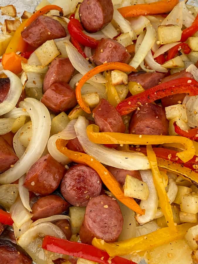 I like turkey kielbasa … low in fat! This is a great veggie mix…