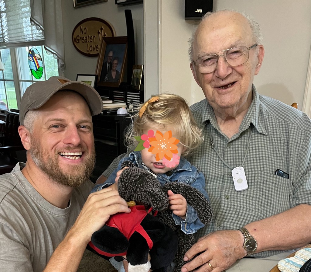 Goldie went to visit “Happy” two weeks ago. She calls my Dad, “Happy”, derived from Pappy. We all love it, especially him! She can pronounce the “P” now, but “Happy” is his name!