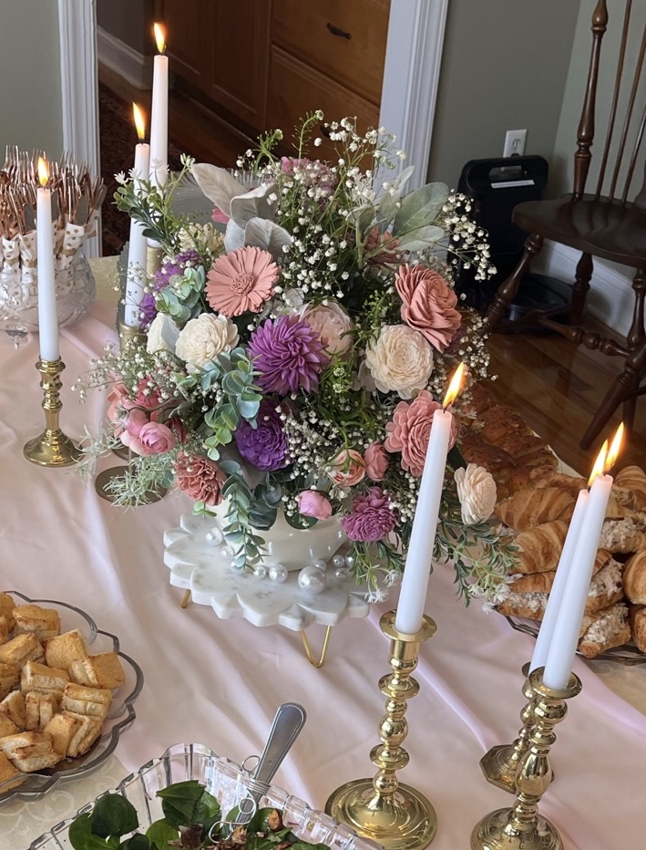 My precious, always thinking of others, daughter asked us shower hostesses to please not use live florals. Even though we all love them, she did not want us to splurge. February does not have any blooming plants where we live, and live florals are at a premium price, especially Valentine’s week.