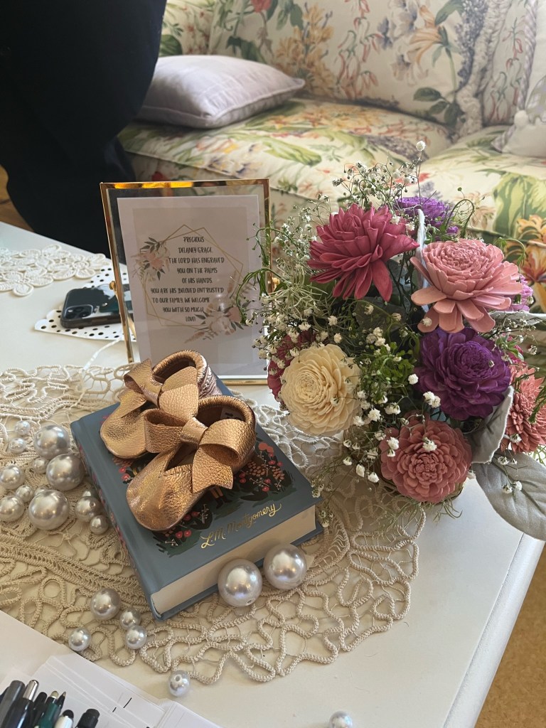 At the end of the shower, Liv and Danny presented his mother and me with a card from Delaney and a bouquet of flowers. The card brought tears… it was our first gift from “Lainey”. The fragrant blooms remind us of all the joy and love to come!!