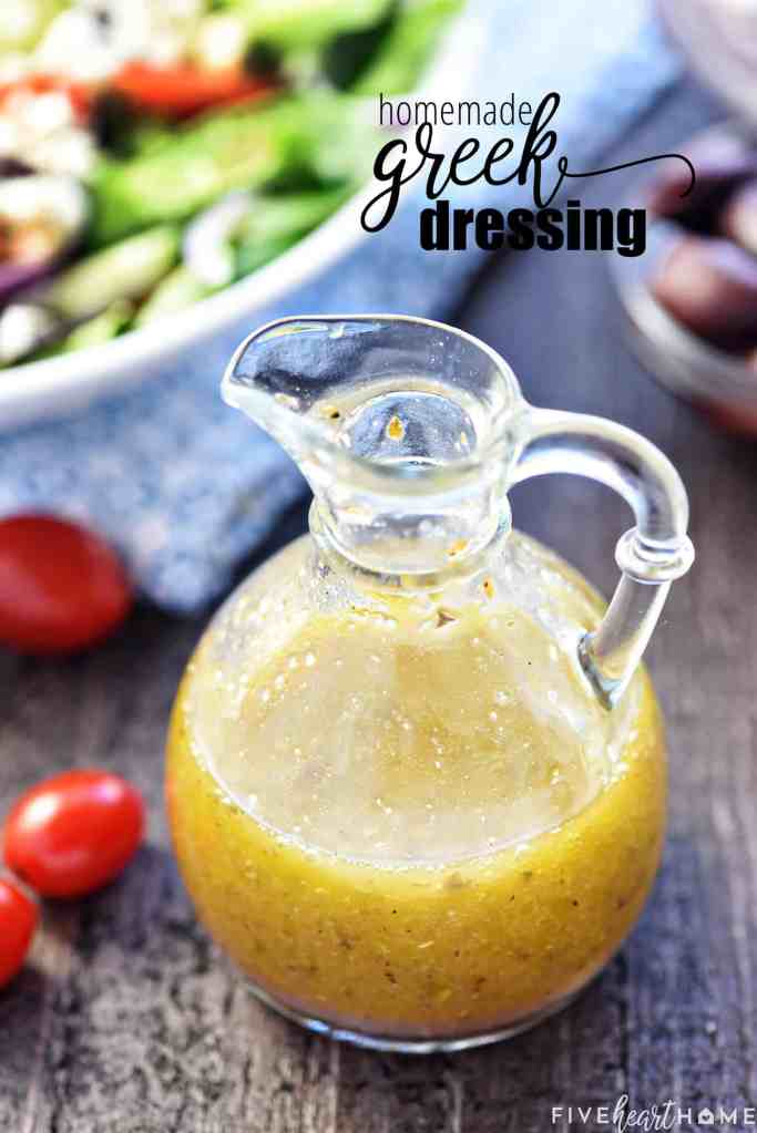 Next, I mixed up a Greek Slaw. I purchased bagged slaw mix added thinly sliced cucumber, a small amount of red onion, and the greens of spring onions. Freshly chopped parsley, a little feta cheese and homemade Greek dressing combined for a wonderful crispy slaw salad. Below is the dressing I mixed up.