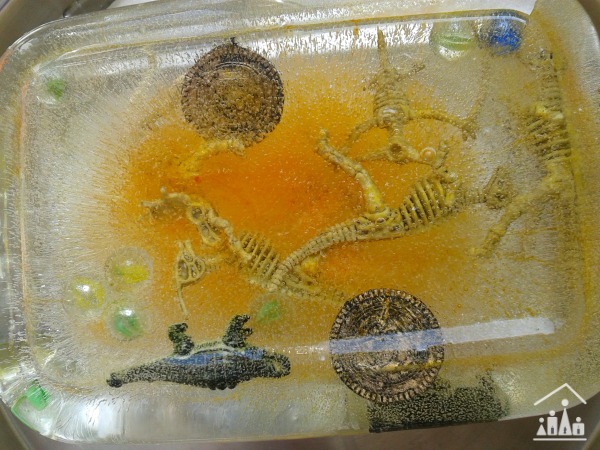 Freeze items for kids to uncover. I have a small ziplock with a few small things to freeze. You can gather a few things from around the house where you visit, if you don’t want to pack them. Toys, kitchen things, office supplies, etc. will do. Anything that is age appropriate. Put them in a container with water and freeze overnight.