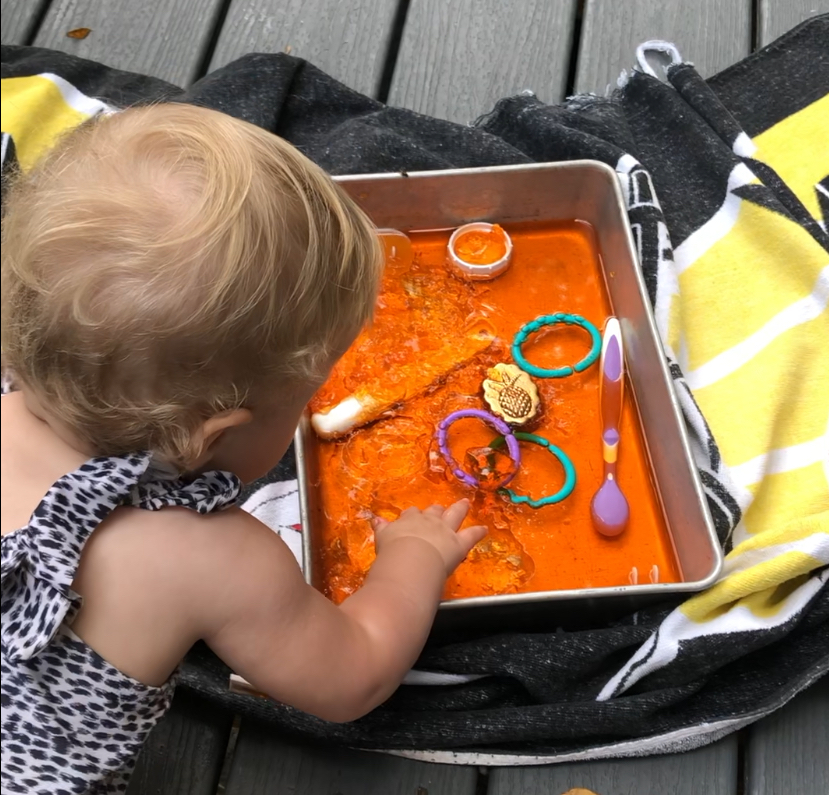 If the “littles” are too young for the ice project above, use jello! With parents’ permission, of course. I mixed up jello and put objects/little toys into the liquid, then refrigerated it till the next day. They may be hesitant at first, but help them discover the new texture and remove all the objects. Of course, a few tastes of the jello will happen. This is an attention keeper. I did this out on my deck on top of a beach towel and had a small swimming pool with water ready for our next play stop. This kept us from producing a sugary, sticky mess😉.