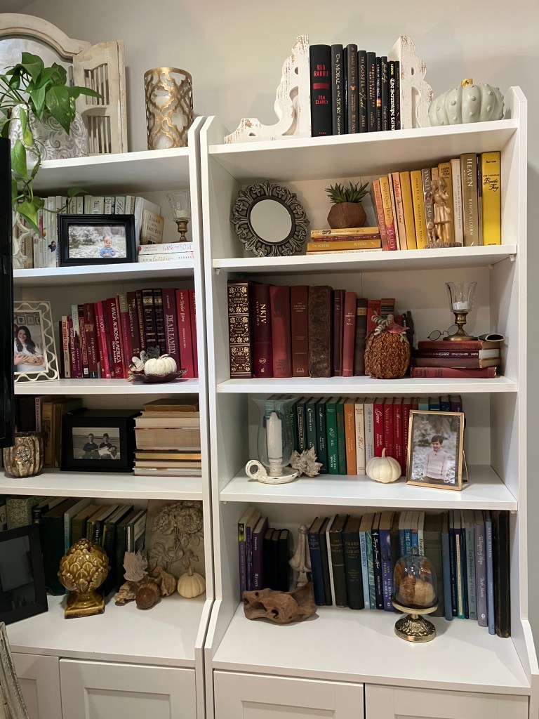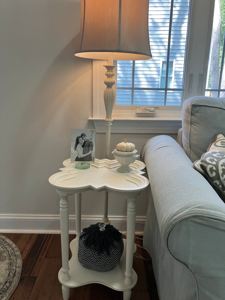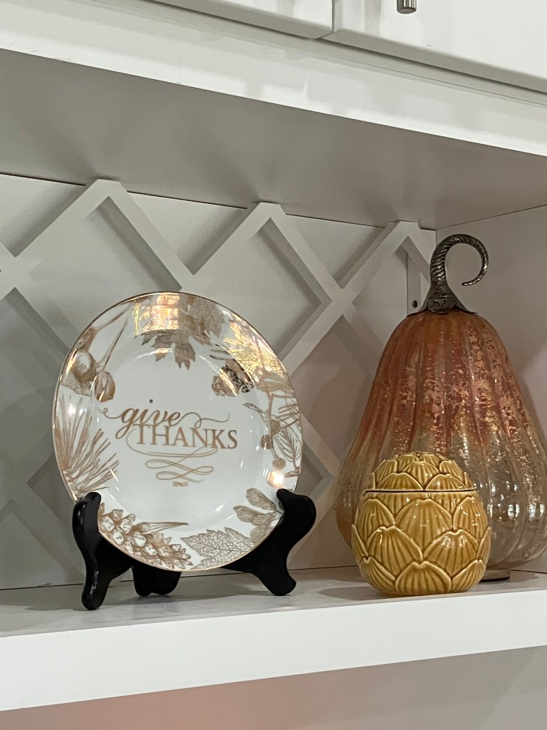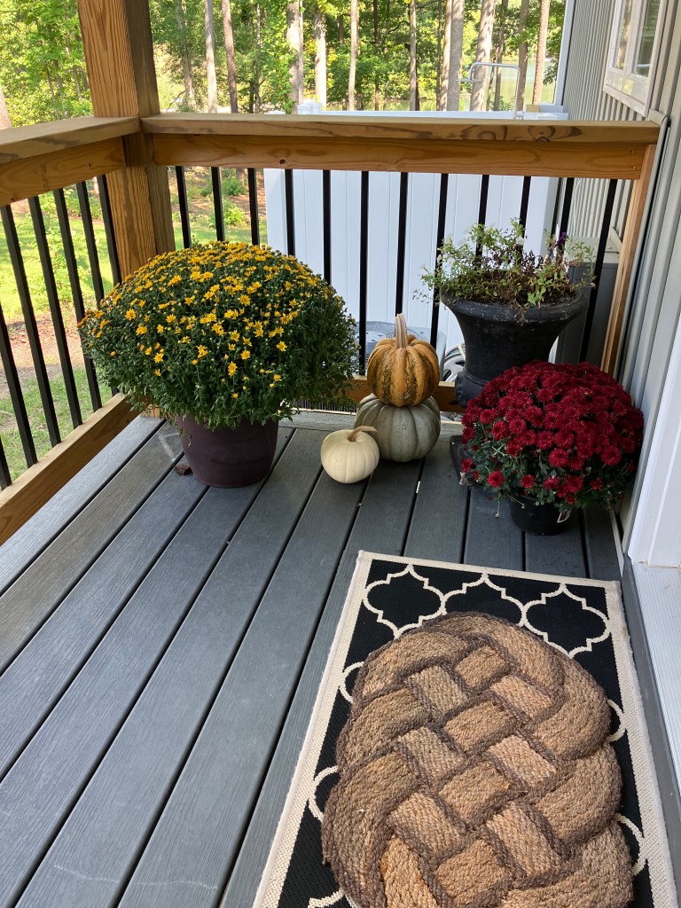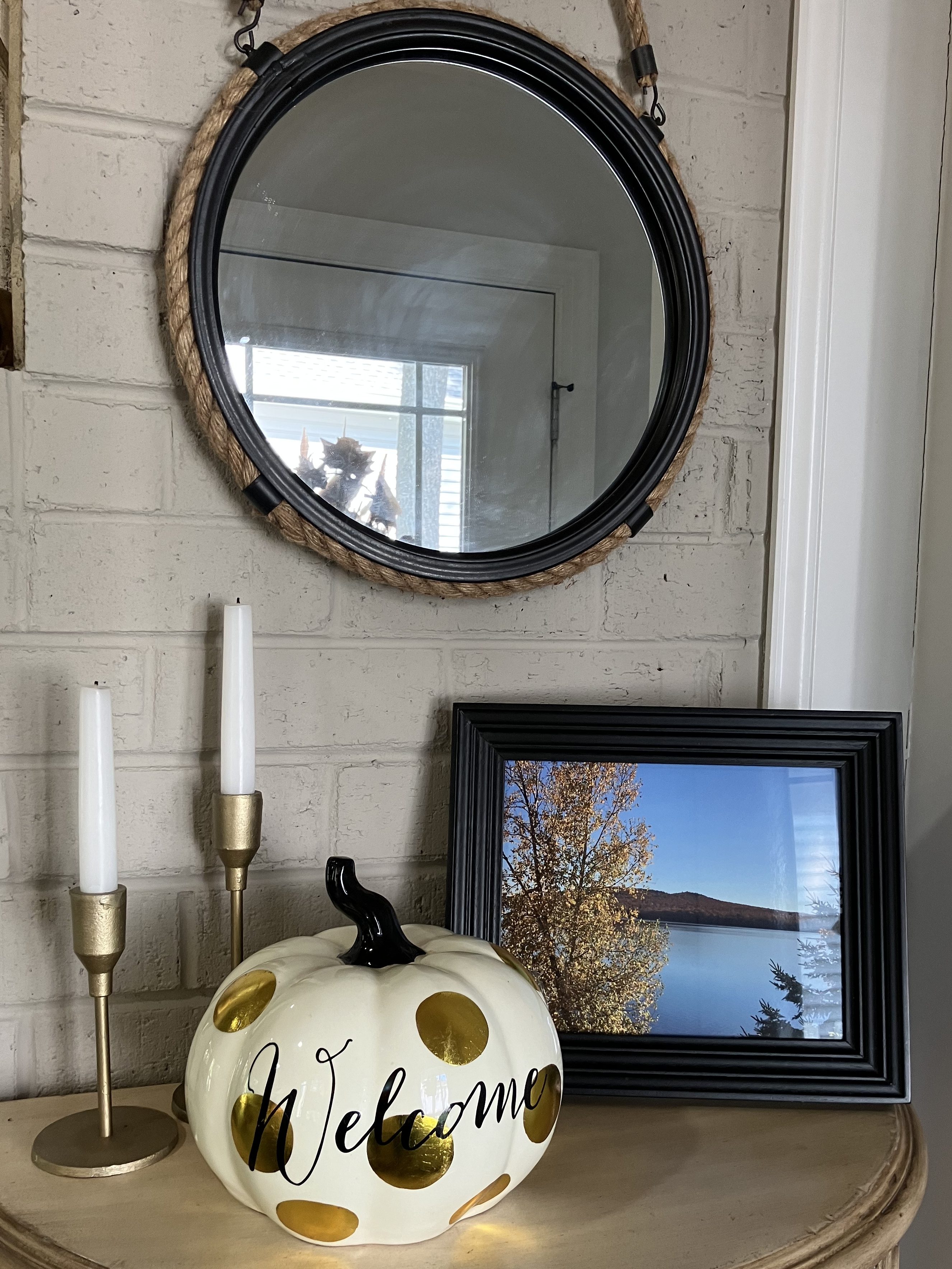4. I basically place things and then decide if I’ll look for anything new. I always buy some real pumpkins. A few for the porch and the small white ones for inside. I wish all of them could be real, but that’s a lot of throwing out and buying. Unless I would choose to do less. I do like my faux ones. Some of them hold special meaning. I have added twigs, branches, pinecones and leaves from outside some years. Depends how much I choose to do.