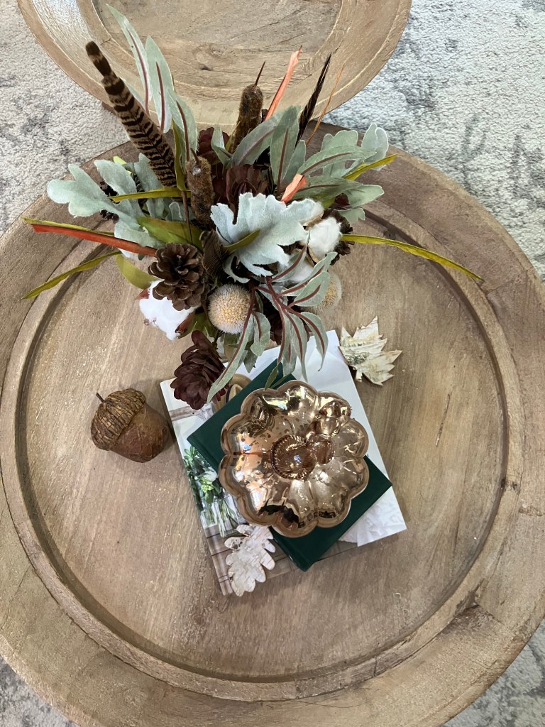 These brown velvet pumpkins were new for me this year. They immediately drew my attention! I knew I’d love them with pheasant feathers. You’ll see them carried through much of my decor. Dad used to hunt pheasants when I was a young child. Mom and Grandma made pillbox hats with them!