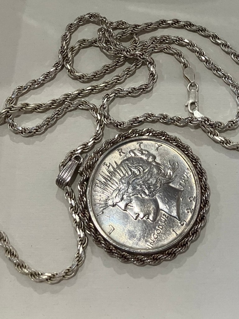 Several years ago, my sister gave me the idea of making one into a necklace! I loved the thought. I made one for all the ladies in my immediate family with the oldest coins I possessed. All of them were dated in the 1920s, mine being 1922. The rest of my silver dollars are still in my possession. I saw one like mine, but not as old, for sale on Amazon for $50. I saw prices beyond that too!