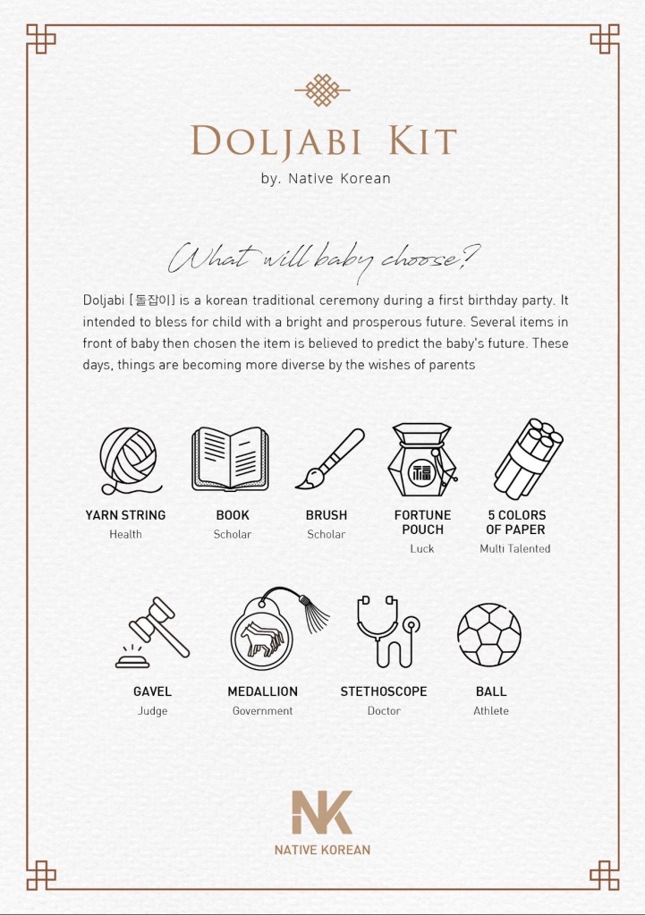In Korean culture, a prediction about the future accompanies the first birthday. A tray of objects is presented to the child. Whichever two objects the child chooses predicts what their future looks like. Of course, it’s just a tradition but interesting! In the current day, parents assign their own meaning to the objects.