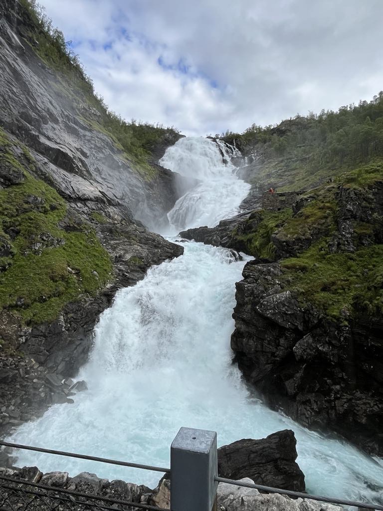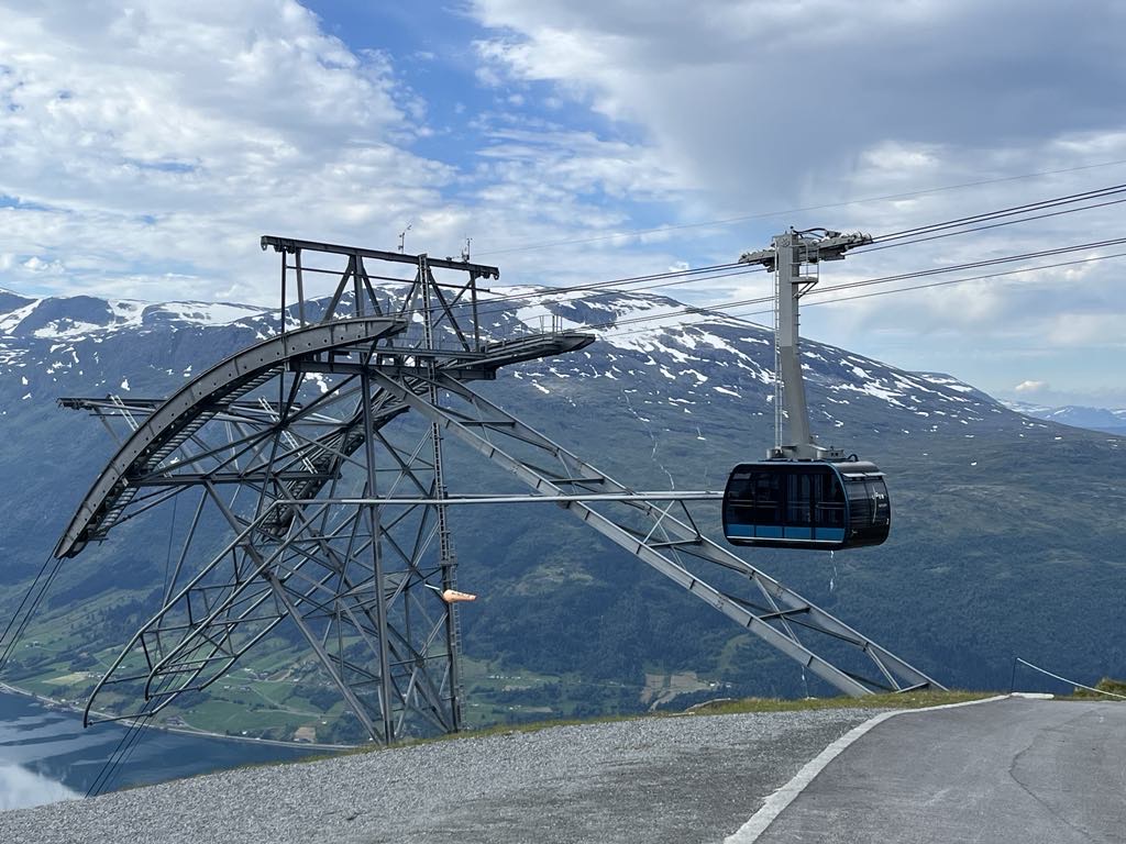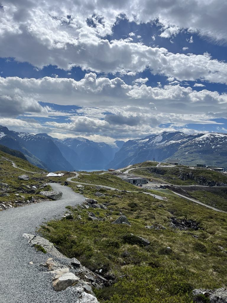 They rode a tram to see the Kjosfossen Falls. And took a sky lift up 3000 ft to Summit of Mount Hoven hiking 120 meters farther on the Gjolrunden trail and another 155 meter climb on the Skredfjellet trail, with great views of the fjord, mountains, and glaciers!