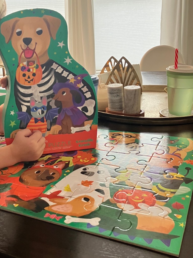 Zee Zee brought some projects and treats in her “Mary Poppins” bag: a “Bluey” Fall/Halloween Playdoh kit, drawing paper with colored pens, new books, Spirograph (for my 8-year-old), scarecrow project, Dog Halloween puzzle, paints, and the cutest Jack ‘O Lantern project.