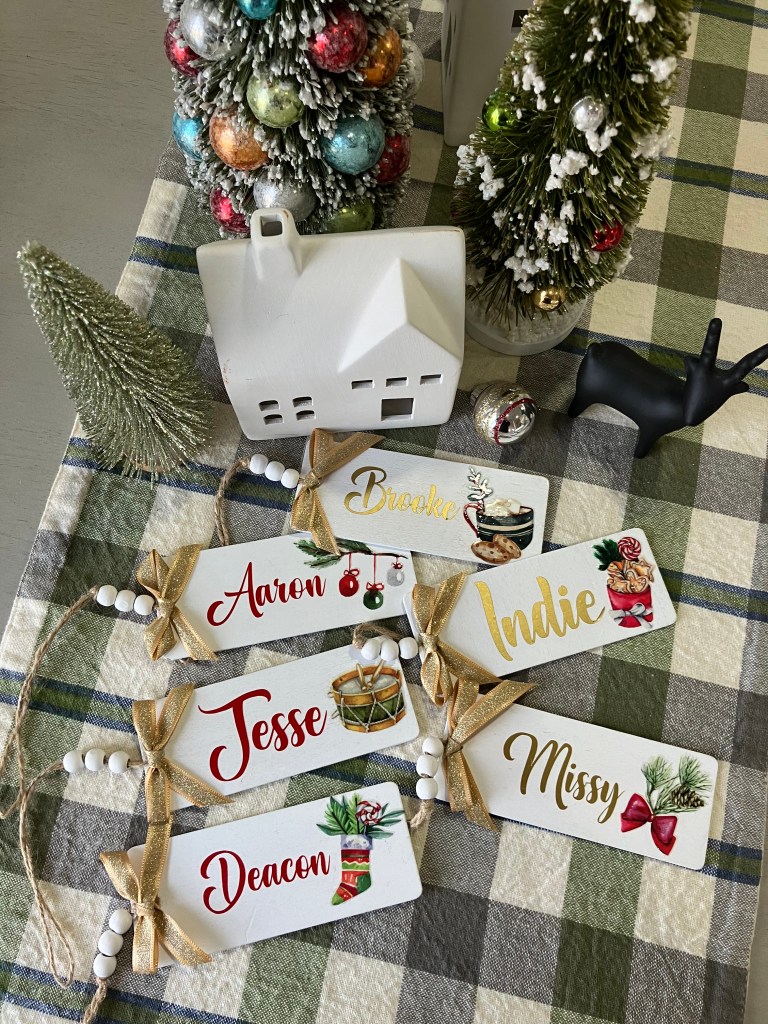 I made tags using my Cricut and a rub on transfer. Easy peezy. I made them at home and brought them in my suitcase. I’ll link the tags and the transfer set I purchased from Amazon.