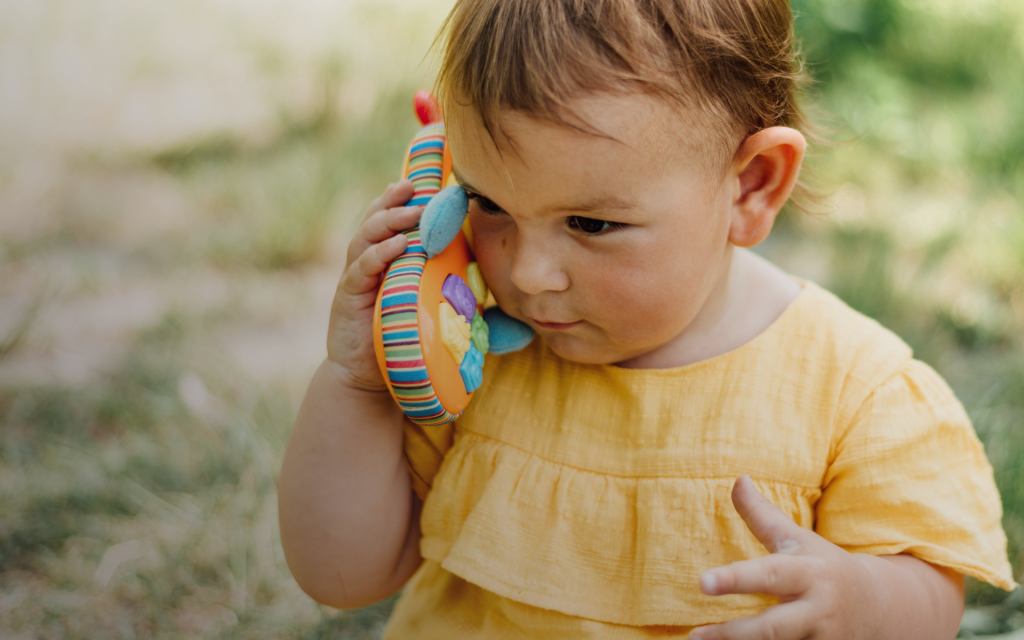 Babble mimics the behavior of every adult their young lives has watched. Using sounds as word substitutes, their adorable selves speak in an unknown language to carry out their pretend conversations.