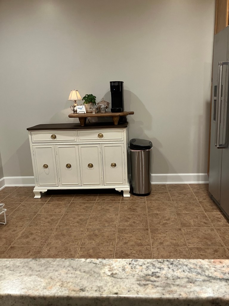 You’ll notice I styled a coffee bar on this piece. My coffee pot is too high to sit on my counters and open under my cabinets, so I knew an “off the counter” spot would be necessary. The large wooden board was a gift from my children two houses ago, and I love it. The problem is, in this new space I have no island or peninsula to style it on! It looked too high and clunky for my new counter configuration. I like it on the new buffet! The trash can is right beside the coffee station for dumping coffee grounds, and the frig is right beside it for filling the reservoir. I tried styling some mugs with it, but haven’t figured out how to style them to my liking. My coffee stash is right inside the first cabinet door.