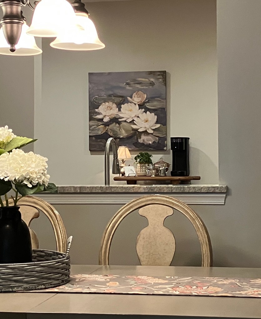 My next quest was for a wall picture. Discussing my design choices with my daughter, we agreed a picture would serve as the window we do not have in this room! There is natural light from the front door that streams in, but no window view. All of my prior kitchens have had a window. When I first looked at the home models in this subdivision, it was a common thread. No kitchen windows … wah wah🙁.